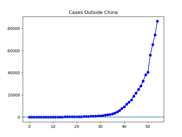 Figure 3. On January 22th, there were eight confirmed cases outside of China. Over the next 27 days, cases grew on hundredfold, to 841. In the next 27 days, they did so again, and now stand at 86,426.