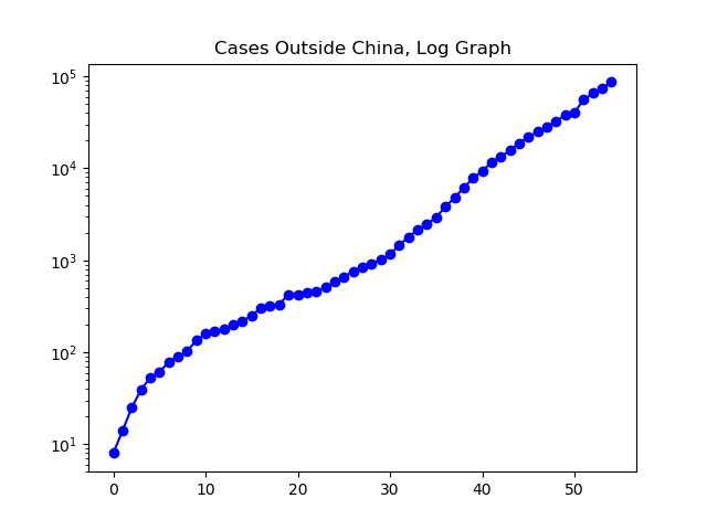 Figure 2. Once one removes the Chinese cases, the story of the new coronavirus is one of unrelenting and approximately exponential growth.