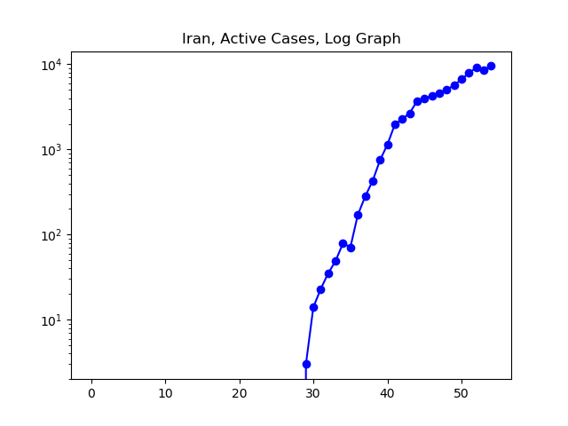 Figure 8. The log graph of Iran's cases seems to show the outbreak slowing. The question is to what degree the reported statistics match reality.
