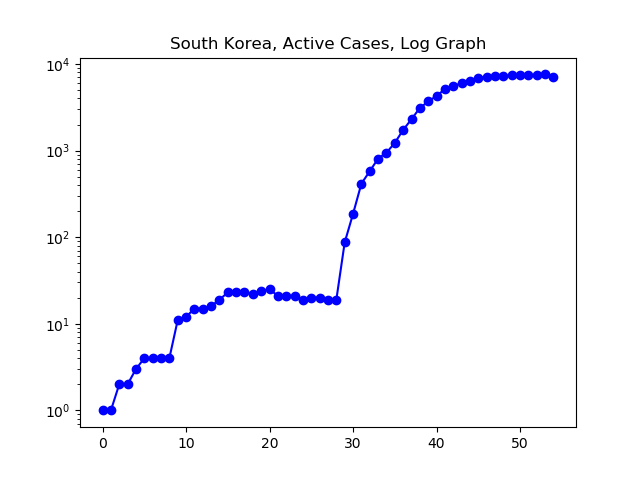 Figure 10. The log graph of South Korea's cases shows that the recent drop is the continuation of a multi-week trend toward a slower and slower growth rate in cases.