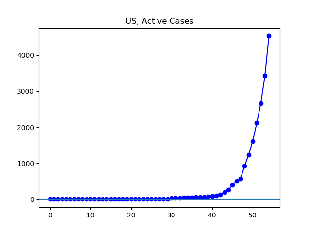 Figure 11. The US is reporting 4530 active cases, about eight times the 575 cases reported a week ago.