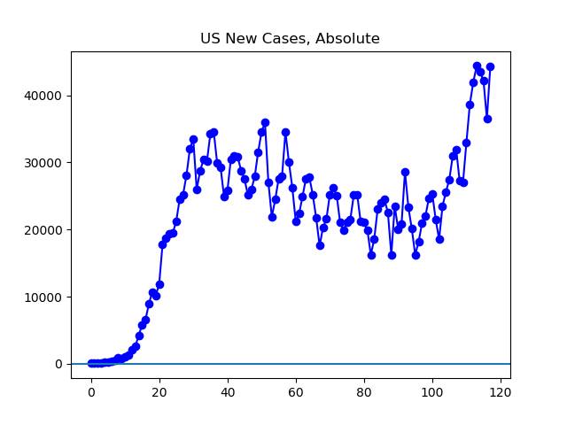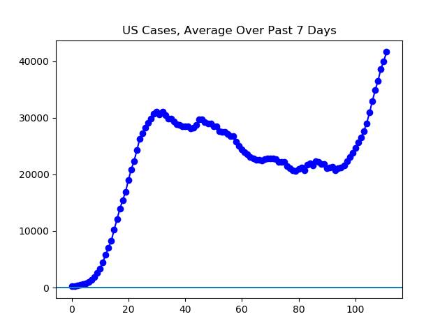 Today the US reported 44,358 cases of the novel coronavirus, up from 32,984 a week ago (Covid Tracking Project). Over the last seven days, we've had 288,620 new cases, the highest ever reported in a seven-day period.
