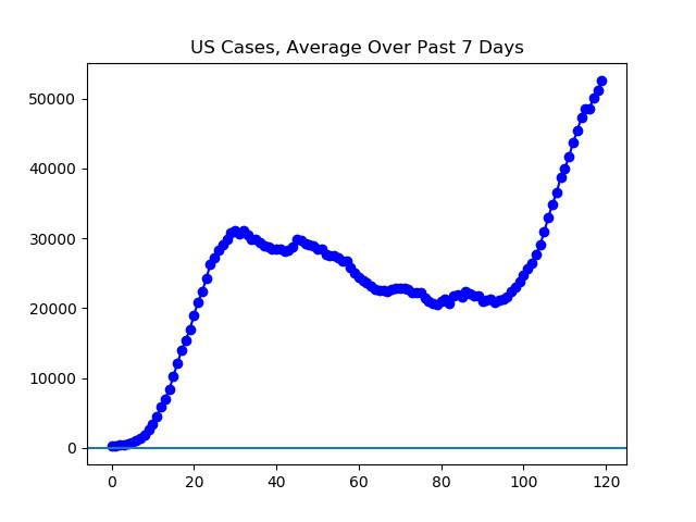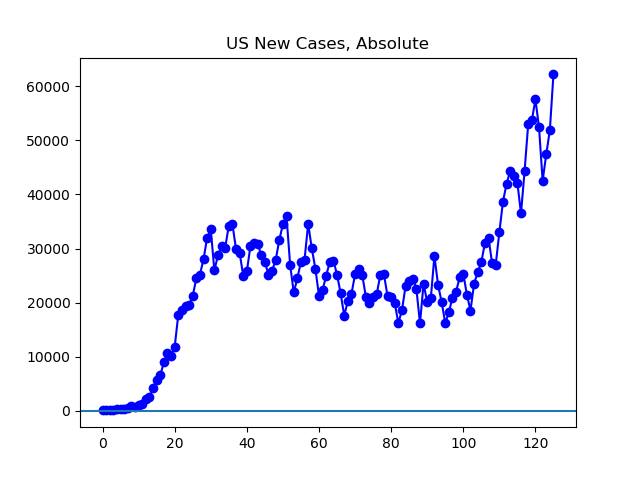 The United States reported 62,197 new cases of the novel coronavirus today, which is the highest number we've seen yet, and up from 52,982 a week ago (Covid Tracking Project).