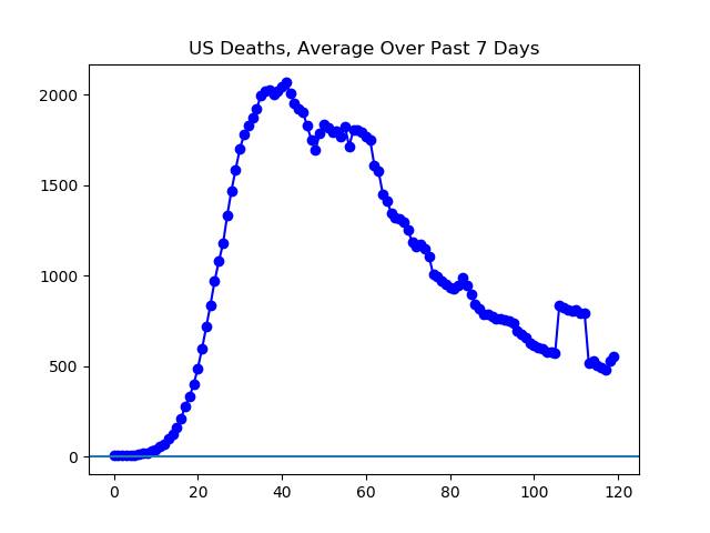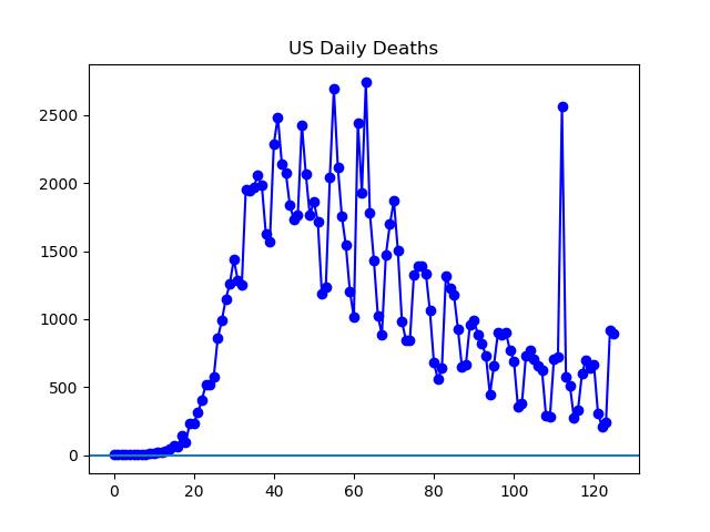 The US reported 889 deaths today, up from 701 a week ago. That's two days in a row up from the week before. That's not a trend yet, but time will tell.